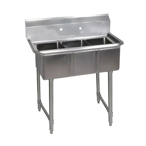 Convenience Store Sink, three compartment, 35-1/2"W x 19-13/16"D x 39-3/4"H overall size, 10" wide x 14" front-to-back x 10" deep compartments, 9"H backsplash, 8" OC splash mount faucet holes, 1-1/2" rolled edges on front & sides, includes basket drains, 18/304 stainless steel deck & bowl, stainless steel legs & side crossbracing, stainless steel over plastic adjustable bullet feet, NSFQ & A