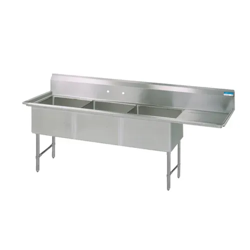 Sink, three compartment, 76-3/16"W x 23-1/2"D x 44-1/16"H overall size, 18” wide x 18” front-to-back x 14” deep compartments, 18" drainboard on right, 10"H backsplash, 8” OC splash mount faucet holes, 1-1/2” rounded front & side edges, includes basket drains, 16/304 stainless steel deck & bowls, stainless steel legs & side bracing, adjustable stainless steel over plastic bullet feet, NSFQ & A