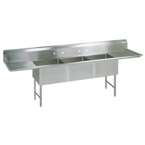 Sink, three compartment, 123-1/4"W x 29-1/2"D x 44-1/16"H overall size, 24” wide x 24” front-to-back x 14” deep compartments, (2) left & right 24" drainboards, 10"H backsplash, (2) sets of 8” OC splash mount faucet holes, 1-1/2” rounded front & side edges, includes basket drains, 16/304 stainless steel deck & bowls, stainless steel legs & side bracing, adjustable stainless steel over plastic bullet feet, NSFQ & A