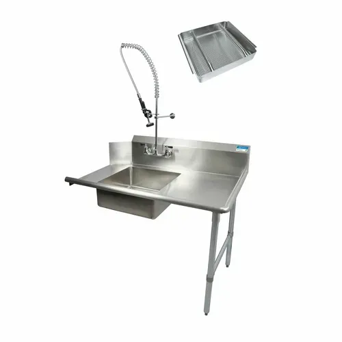 Soiled Dishtable, straight design, 26"W x 30-3/8"D x 46-1/4"H, right-to-left operation, 18/304 stainless steel top, 20" x 20" x 8" deep pre-rinse sink, 8" OC splash mount pre-rinse faucet (BKF-SMPR-WB-G), 10"H backsplash, raised rolled edges on front & sides, (1) pre-rinse basket (BK-PRB-5), includes basket drain (BKDR-4), galvanized legs & side bracing, high impact corrosion resistant adjustable bullet feet, NSFQ & A