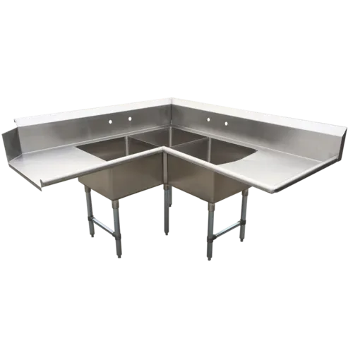 Soiled Dishtable, corner design, three compartment, 65-3/4"W x 67-1/4"D x 44"H overall size, right-to-left operation, 20" wide x 20" front-to-back x 12" deep compartments, 10"H backsplash, (2) sets of 8" OC splash mount faucet holes, includes: (3) BKDR-4 basket drains, (2) BK-SDTS tray guides & (1) BK-PRB-5 pre-rinse basket, 18/304 stainless steel top, stainless steel legs & side bracing, NSFQ & A