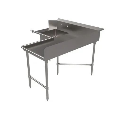 Soiled Dishtable, corner design, 60"W x 96"D, L-shaped, 20" x 20" x 8" welded bowl, right to left operation, 1-5/8" rolled edge, 10" backsplash, 30-3/8" front to back, front to back end bracing, 16/304 stainless steel top, stainless steel legs and bracing, NSF (3 – 10 Business Day Lead Time)Q & A