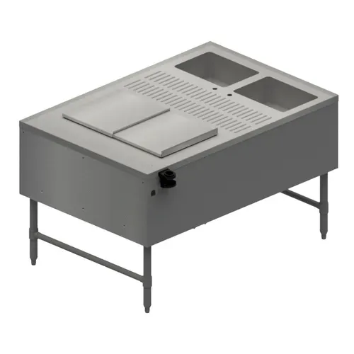 Underbar Ice Bin/Cocktail Station, standard pass-thru unit, 52"W x 35"D x 30"H, overall size, includes: 10-1/2" deep pass-thru ice bin with 10-circuit cold plate, dual service dump sinks with (2) drains, 4" O.C. Workforce Faucet with 8" swing spout, (BKD-8-G), soda gun holder; 18/304 stainless steel construction, stainless steel legs & side bracing, adjustable high impact corrosion resistant feetQ & A