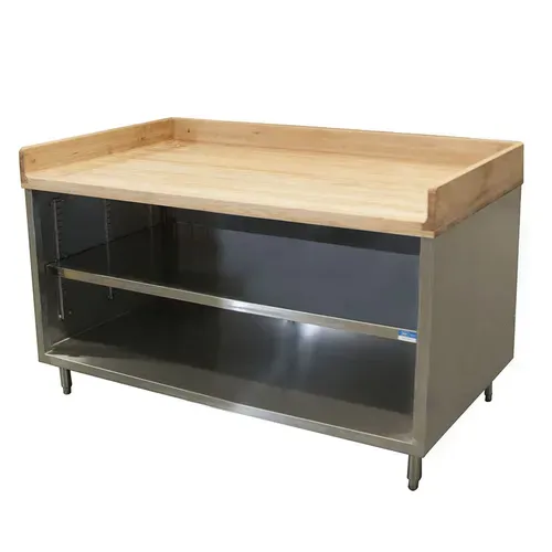 Chef Table, cabinet base with open front, 48"W x 36"D x 39"H overall size, 1-3/4" thick Hard Maple Bakers Top with 4" coved riser on back and sides, 18/304 stainless steel body, enclosed with stainless steel panels on sides and rear, 6” stainless steel legs with 1" height adjustment, stainless steel feet, NSFQ & A