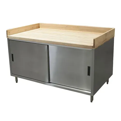 Chef Table, cabinet base with sliding doors, 48"W x 36"D x 39"H overall size, 1-3/4" thick Hard Maple Bakers Top with 4" coved riser on back and sides, 18/304 stainless steel body, (1) set of sliding doors, enclosed with stainless steel panels on sides and rear, 6” stainless steel legs with 1" height adjustment, stainless steel feet, NSF (3-10 day lead time)Q & A