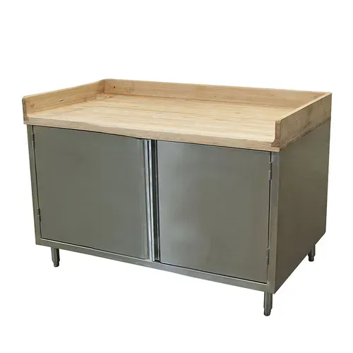 Chef Table, cabinet base with hinged doors, 60"W x 36"D x 39"H overall size, 1-3/4" thick Hard Maple Bakers Top with 4" coved riser on back and sides, 18/304 stainless steel body, (1) set of hinged doors, enclosed with stainless steel panels on sides and rear, 6” stainless steel legs with 1" height adjustment, stainless steel feet, NSF (3-10 day lead time)Q & A