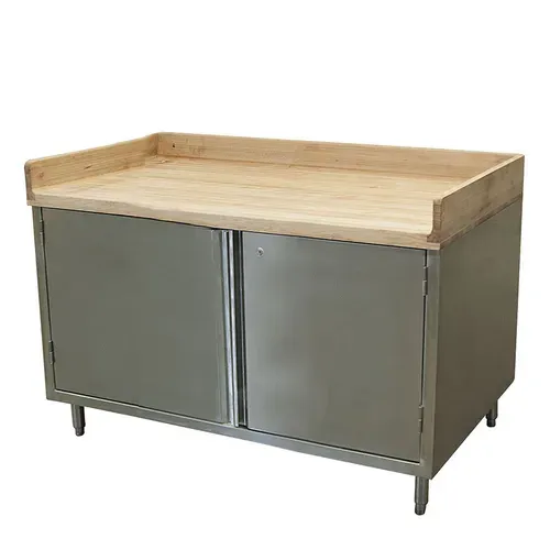 Chef Table, cabinet base with hinged doors & lock, 60"W x 36"D x 39"H overall size, 1-3/4" thick Hard Maple Bakers Top with 4" coved riser on back and sides, 18/304 stainless steel body, (1) set hinged doors with lock, enclosed with stainless steel panels on sides and rear, 6” stainless steel legs with 1" height adjustment, stainless steel feet, NSF (3-10 day lead time)Q & A