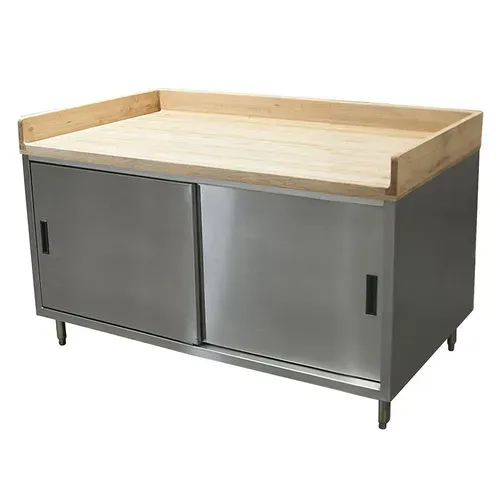 Chef Table, cabinet base with sliding doors, 60"W x 36"D x 39"H overall size, 1-3/4" thick Hard Maple Bakers Top with 4" coved riser on back and sides, 18/304 stainless steel body, (1) set of sliding doors, enclosed with stainless steel panels on sides and rear, 6” stainless steel legs with 1" height adjustment, stainless steel feet, NSF (3-10 day lead time)Q & A