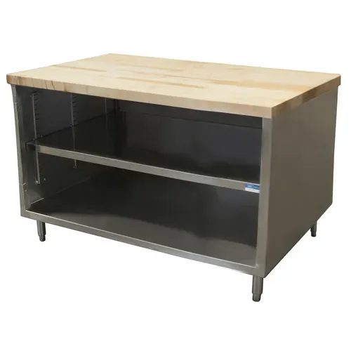 Chef Table, cabinet base with open front, 48"W x 30"D x 34-3/4"H overall size, 1-3/4" thick hard maple flat top with penetrating oil finish, 18/304 stainless steel body, enclosed with stainless steel panels on sides and rear, 6” stainless steel legs with 1" height adjustment, stainless steel feet, NSFQ & A