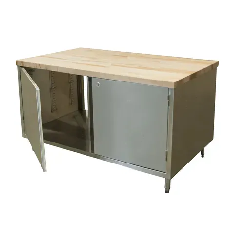 Dual Access Chef Table, cabinet base with hinged doors & lock on both sides, 60"W x 30"D x 34-3/4"H overall size, 1-3/4" thick hard maple flat top with penetrating oil finish, 18/304 stainless steel body, (1) set of hinged doors with lock on each side, 6” stainless steel legs with 1" height adjustment, stainless steel feet, NSF (3-10 day lead time)Q & A