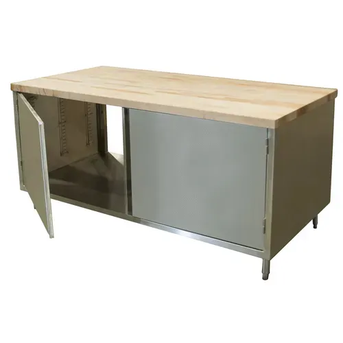 Dual Access Chef Table, cabinet base with hinged doors on both sides, 72"W x 30"D x 34-3/4"H overall size, 1-3/4" thick hard maple flat top with penetrating oil finish, 18/304 stainless steel body, (1) set of hinged doors on each side, 6” stainless steel legs with 1" height adjustment, stainless steel feet, NSF (3-10 day lead time)Q & A