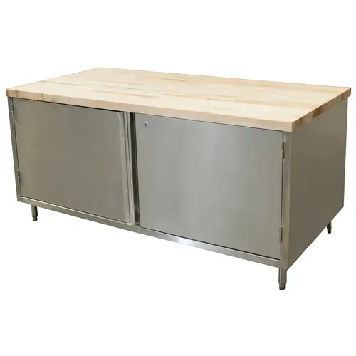 Chef Table, cabinet base with hinged doors & lock, 72"W x 30"D x 34-3/4"H overall size, 1-3/4" thick hard maple flat top with penetrating oil finish, 18/304 stainless steel body, (1) set of hinged doors with lock, 6” stainless steel legs with 1" height adjustment, stainless steel feet, NSF (3-10 day lead time)Q & A