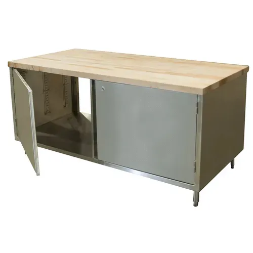 Dual Access Chef Table, cabinet base with hinged doors & lock on both sides, 72"W x 30"D x 34-3/4"H overall size, 1-3/4" thick hard maple flat top with penetrating oil finish, 18/304 stainless steel body, (1) set of hinged doors with lock on each side, 6” stainless steel legs with 1" height adjustment, stainless steel feet, NSF (3-10 day lead time)Q & A