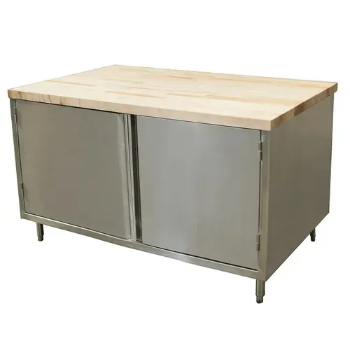 Chef Table, cabinet base with hinged doors, 48"W x 36"D x 34-3/4"H overall size, 1-3/4" thick hard maple flat top with penetrating oil finish, 18/304 stainless steel body, (1) set of hinged doors, 6” stainless steel legs with 1" height adjustment, stainless steel feet, NSF (3-10 day lead time)Q & A