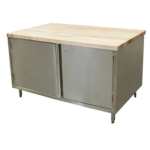 Chef Table, cabinet base with hinged doors & lock, 48"W x 36"D x 34-3/4"H overall size, 1-3/4" thick hard maple flat top with penetrating oil finish, 18/304 stainless steel body, (1) set of hinged doors with lock, 6” stainless steel legs with 1" height adjustment, stainless steel feet, NSF (3-10 day lead time)Q & A