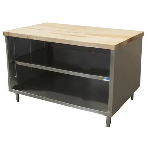 Chef Table, cabinet base with open front, 60"W x 36"D x 34-3/4"H overall size, 1-3/4" thick hard maple flat top with penetrating oil finish, 18/304 stainless steel body, enclosed with stainless steel panels on sides and rear, 6” stainless steel legs with 1" height adjustment, stainless steel feet, NSFQ & A