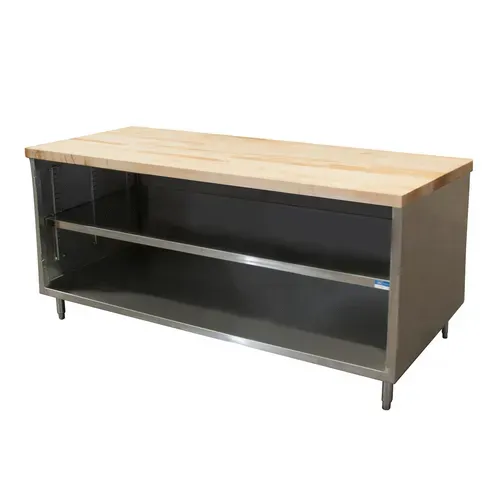 Chef Table, cabinet base with open front, 72"W x 36"D x 34-3/4"H overall size, 1-3/4" thick hard maple flat top with penetrating oil finish, 18/304 stainless steel body, enclosed with stainless steel panels on sides and rear, 6” stainless steel legs with 1" height adjustment, stainless steel feet, NSFQ & A