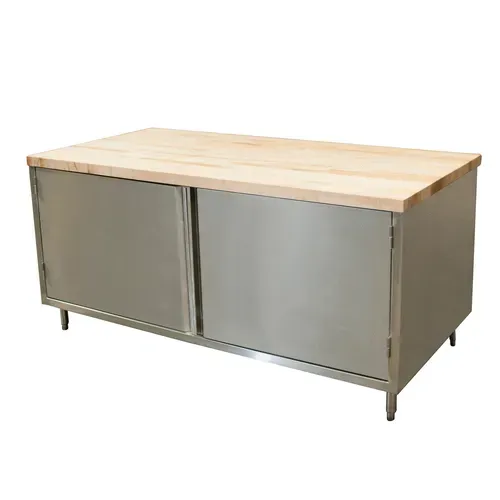 Chef Table, cabinet base with hinged doors, 72"W x 36"D x 34-3/4"H overall size, 1-3/4" thick hard maple flat top with penetrating oil finish, 18/304 stainless steel body, (1) set of hinged doors, 6” stainless steel legs with 1" height adjustment, stainless steel feet, NSF (3-10 day lead time)Q & A