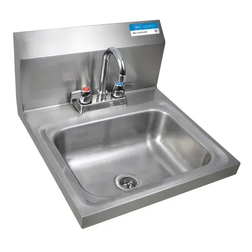 Premier Case Pack with Free Shipping of (4) BKHS-D-1410-P-G Hand Sinks, wall mount, 14" wide x 10" front-to-back x 5" deep bowl, 4" O.C deck mount faucet (BKD-3G-G, lead free), marine edge, includes basket drain & wall mounting hardware, 304 stainless steel construction, NSFQ & A