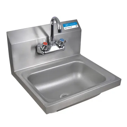 Premier Case Pack with Free Shipping of (4) BKHS-W-1410-P-G Hand Sinks, wall mount, 14" wide x 10" front-to-back x 5" deep bowl, 4" OC splash mount faucet (BKF-W-3G-G, lead free), marine edge, 8-1/8" backsplash, includes 1-7/8" basket drain with crumb cup & wall mounting hardware, 304 stainless steel construction, NSFQ & A