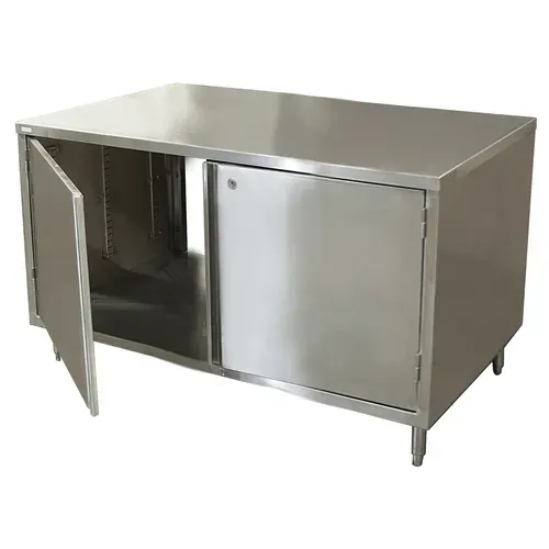 Dual Access Chef Table, cabinet base with hinged doors & locks on both sides, 60"W x 24"D x 34-3/4"H overall size, 16/304 stainless steel top, 18/304 stainless steel body, (1) set of doors with locks on each side, 6” stainless steel legs with 1" height adjustment, stainless steel feet, NSF (3-10 day lead time)Q & A