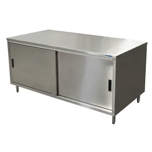 Chef Table, cabinet base with sliding doors, 72"W x 24"D x 34-3/4"H overall size, 16/304 stainless steel top, 18/304 stainless steel body, (1) set of doors, 6” stainless steel legs with 1" height adjustment, stainless steel feet, NSF (3-10 day lead time)Q & A