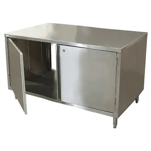Dual Access Chef Table, cabinet base with hinged doors & locks on both sides, 48"W x 36"D x 34-3/4"H overall size, 16/304 stainless steel top, 18/304 stainless steel body, (1) set of doors with lock on each side, 6” stainless steel legs with 1" height adjustment, stainless steel feet, NSF (3-10 day lead time)Q & A