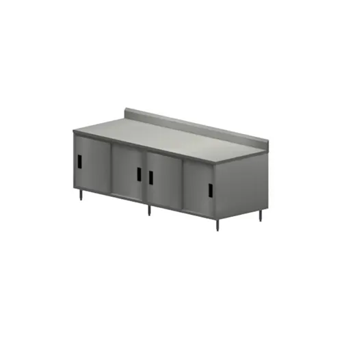 Chef Table, cabinet base with sliding doors, 120"W x 30"D x 34-3/4"H overall size, 16/304 stainless steel top with 5" back riser, 18/304 stainless steel body, (1) set of hinged doors, 6" stainless steel adjustable legs, NSF (5-7 day lead time)Q & A