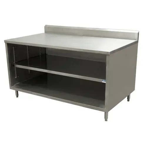 Chef Table, cabinet base with open front, 48"W x 30"D x 39-3/4"H overall size, 16/304 stainless steel top with 5" back riser, 18/304 stainless steel body, 6” stainless steel legs with 1" height adjustment, stainless steel feet, NSFQ & A