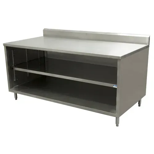 Chef Table, cabinet base with open front, 72"W x 30"D x 39-3/4"H overall size, 16/304 stainless steel top with 5" back riser, 18/304 stainless steel body, 6” stainless steel legs with 1" height adjustment, stainless steel feet, NSFQ & A