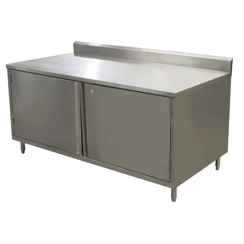 Work Table, cabinet base with hinged doors & locks, 72"W x 30"D x 39-3/4"H overall size, 16/304 stainless steel top with 5" back riser, 18/304 stainless steel body, (1) set of hinged doors with lock, 6" stainless steel adjustable legs, NSF (3-10 day lead time)Q & A