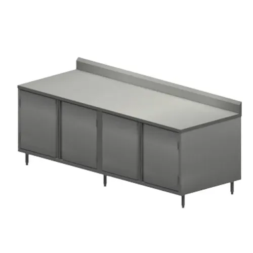 Chef Table, cabinet base with hinged doors, 96"W x 30"D x 39-3/4"H overall size, 16/304 stainless steel top with 5" back riser, 18/304 stainless steel body, center mullion, (2) sets of doors, 6” stainless steel legs with 1" height adjustment, stainless steel feet, NSF (3-10 day lead time)Q & A