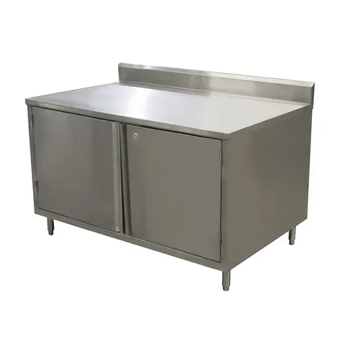 Work Table, cabinet base with hinged doors & locks, 48"W x 36"D x 39-3/4"H overall size, 16/304 stainless steel top with 5" back riser, 18/304 stainless steel body, (1) set of hinged doors with lock, 6" stainless steel adjustable legs, NSF (3-10 day lead time)Q & A