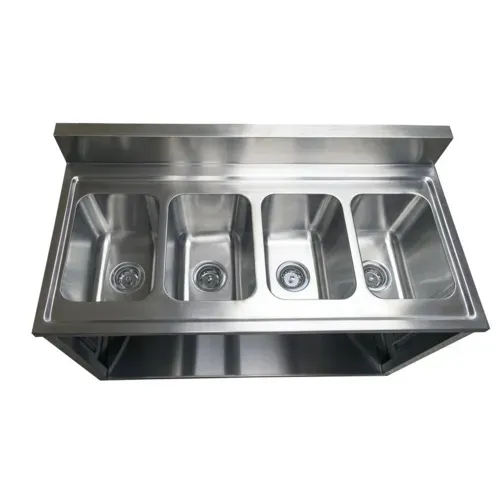 Sink Cabinet, (4) compartment, overall dimensions 48"W x 24"D x 39-3/4"H, working height 34-3/4", 18/304 stainless steel, deep drawn contruction, marine edge, hinged doors, accepts (2) 4" OC faucets, includes (2) BKD-10G-G 10" gooseneck faucets, (4) BKDR-4 drains, NSFQ & A