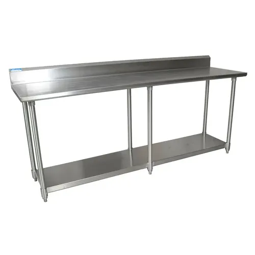 Work Table, 96"W x 30"D x 34-3/4"H overall size, 16/304 stainless steel top with 5"H riser, reinforced with (2) 2" rectangular steel tubing, adjustable stainless steel undershelf, (6) 1-5/8" dia. stainless steel legs, adjustable stainless steel feet, NSFQ & A
