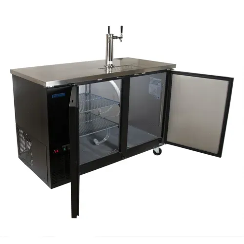 Kegerator Beer Dispenser, 60", (2) double head tap, 4” casters, (2) door, (1) tower, (2) keg capacity, electronic control system, self closing doors with locks, eco-friendly hydro-carbon refrigerant, temp range 33ºF to 41ºF, black vinyl exterior, ETL, ETL sanitationQ & A