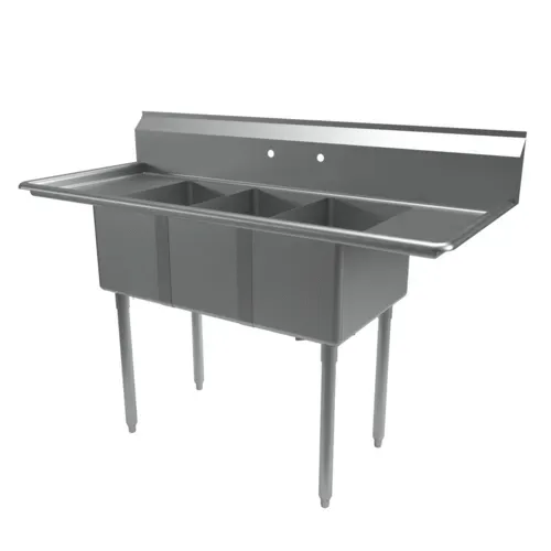 Economy Sink, three compartment, 60" x 25-13/16" overall size, 12" wide x 20" front-to-back x 12" deep compartments, 9"H backsplash, (2) 18" drainboards, 1/2" rounded front & side edges, 8" OC splash mount faucet holes, (3) (BKDR-4) 3-1/2" drains Included, 18 gauge stainless steel deck & bowls, galvanized legs, adjustable high impact corrosion resistant feet (NET)Q & A