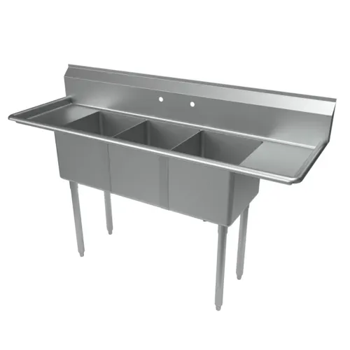 Economy Sink, three compartment, 66" x 21-13/16" overall size, 14" wide x 16" front-to-back x 12" deep compartments, 9"H backsplash, (2) 12" drainboards, 1/2" rounded front & side edges, 8" OC splash mount faucet holes, (3) (BKDR-4) 3-1/2" drains Included, 18 gauge stainless steel deck & bowls, galvanized legs, adjustable high impact corrosion resistant feet (NET)Q & A