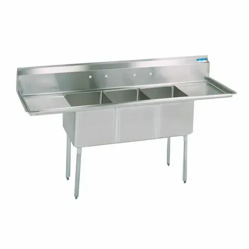 Economy Sink, three compartment, 120"W x 29-13/16"D x 43-3/4"H overall size, 24” wide x 24” front-to-back x 14” deep compartments, (2) left & right 24" drainboards, 9”H backsplash, 1-1/2” rounded front & side edges, (2) sets of 8” OC splash mount faucet holes, drains included, 18 gauge stainless steel deck & bowls, galvanized legs, adjustable high impact corrosion resistant feet, NSF (NET)Q & A