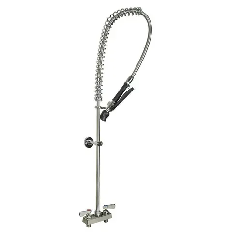 Evolution Pre-Rinse Assembly, deck mount, 4" OC, 12" wall bracket, 1/4 turn ceramic cartridges, integral check valves, color coded hot & cold indicators, stainless steel dual pattern spray head, stainless steel faucet base waterways, 1/2" female inletsQ & A