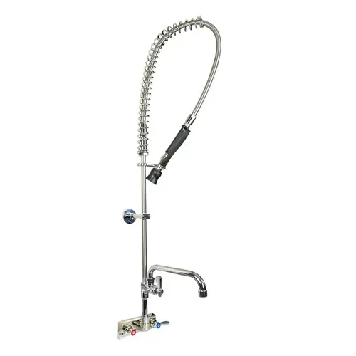 Evolution Pre-Rinse Assembly with add-on faucet, splash mount, 4" OC, add-on faucet with 12" swing spout, 12" wall bracket, 1/4 turn ceramic cartridges, integral check valves, color coded hot & cold indicators, stainless steel dual pattern spray head, stainless steel faucet base waterways, 1/2" female inletsQ & A