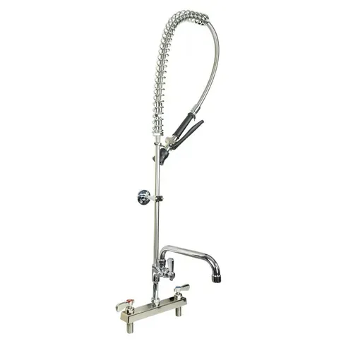 Evolution Pre-Rinse Assembly with add-on faucet, deck mount, 8" OC, add-on faucet with 12" swing spout, 12" wall bracket, 1/4 turn ceramic cartridges, integral check valves, color coded hot & cold indicators, stainless steel dual pattern spray head, stainless steel faucet base waterways, 1/2" female inletsQ & A