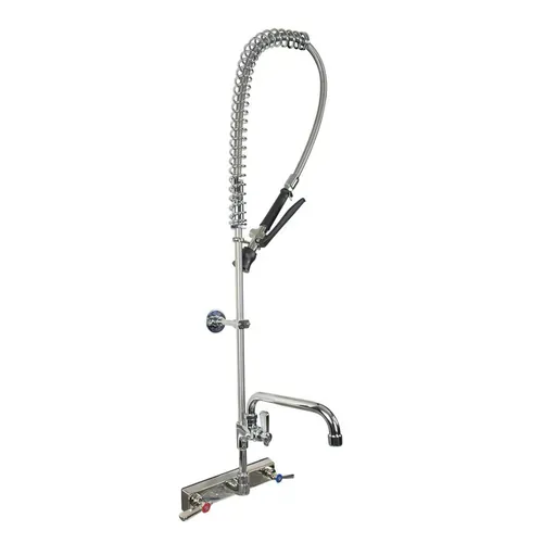Evolution Pre-Rinse Assembly with add-on faucet, splash mount, 8" OC, add-on faucet with 12" swing spout, 12" wall bracket, 1/4 turn ceramic cartridges, integral check valves, color coded hot & cold indicators, stainless steel dual pattern spray head, stainless steel faucet base waterways, 1/2" female inletsQ & A