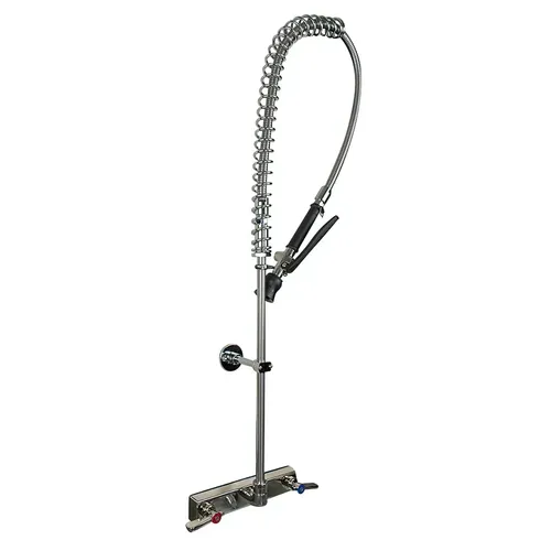 Evolution Pre-Rinse Assembly, splash mount, 8" OC, 12" wall bracket, 1/4 turn ceramic cartridges, integral check valves, color coded hot & cold indicators, stainless steel dual pattern spray head, stainless steel faucet base waterways, 1/2" female inletsQ & A