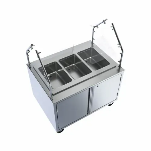 3 Well Portable Hot Food Buffet Station, 3-well, 48"W x 36"D x 59-3/16”H, dual sided cafeteria style sneeze guard, locking storage and secured Thermostatic Controls (behind doors), 18 ga stainless steel cabinet, 20 ga exterior food well, 18/304 stainless steel top and well liner, 3/4" NPT Drains with removable screens, casters with lock, 12.5 amps, 3000 Watts, NEMA 6-15P, 240V, designed and assembled in BK Resources midwest factory, 3-10 Day Lead TimeQ & A