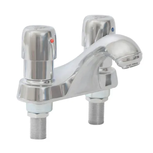 Metering Faucet, deck mount, 4" centers, integral spout, 2.0 gpm vandal resistant aerator, vandal resistant push handles, adjustable metering cartridges, 1/2” NPS connection, chrome plated brass, lead free, NSF, ADA CompliantQ & A