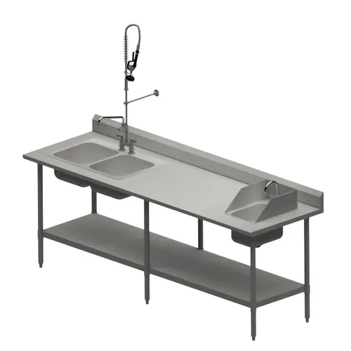 Work Table with Prep & Hand Sinks, 96"W x 30"D, includes: (1) CVTR5-9630 work table with undershelf, (1) DDI2-14161024 two-compartment sink, (1) BKF-4HDDPR-WB-G pre-rinse assembly with 10" add-on faucet & wall bracket, & (1) DDI-10141024S-P-G, hand sink with faucet & side splashes, 16/304 stainless steel top, stainless steel adjustable legs & feetQ & A