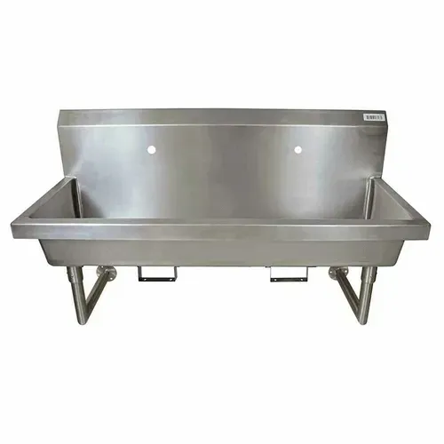 Two Station Handwash Sink, wall mounted, (2) single hole splash mount faucet holes, 48"W x 19-7/8" front-to-back x 8" deep bowl, knee valve bracket, 14/304 stainless steel sink, basket drain, 18 gauge stainless steel legs & supports, NSF (3-5 day lead time)Q & A