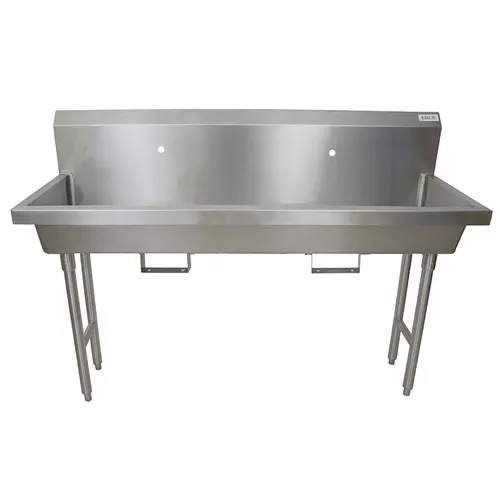 Two Station Handwash Sink, freestanding, (2) single hole splash mount faucet holes, 60"W x 19-7/8" front-to-back x 8" deep bowl, knee valve bracket, 14/304 stainless steel sink, basket drain, 18 gauge stainless steel legs & supports, NSF (3-5 day lead time)Q & A