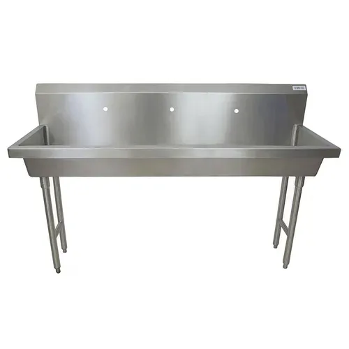 Three Station Handwash Sink, freestanding, (3) single hole splash mount faucet holes, 72"W x 19-7/8" front-to-back x 8" deep bowl, 14/304 stainless steel sink, basket drain, 18 gauge stainless steel legs & supports, NSF (3-5 day lead time)Q & A